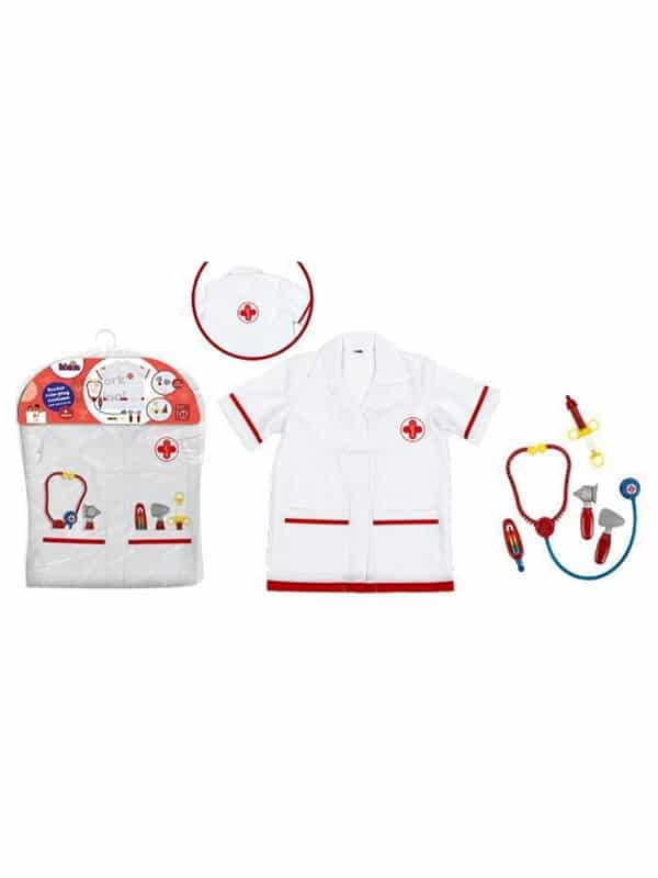 Klar til lægeleg! Denne lægekitel med redskaber indeholder alt, hvad den lille læge har brug for – blandt andet stetoskop, pincet, øretermometer og sprøjte. Perfekt til rolleleg, der styrker fantasi og empati. Anbefalet fra 3 år.